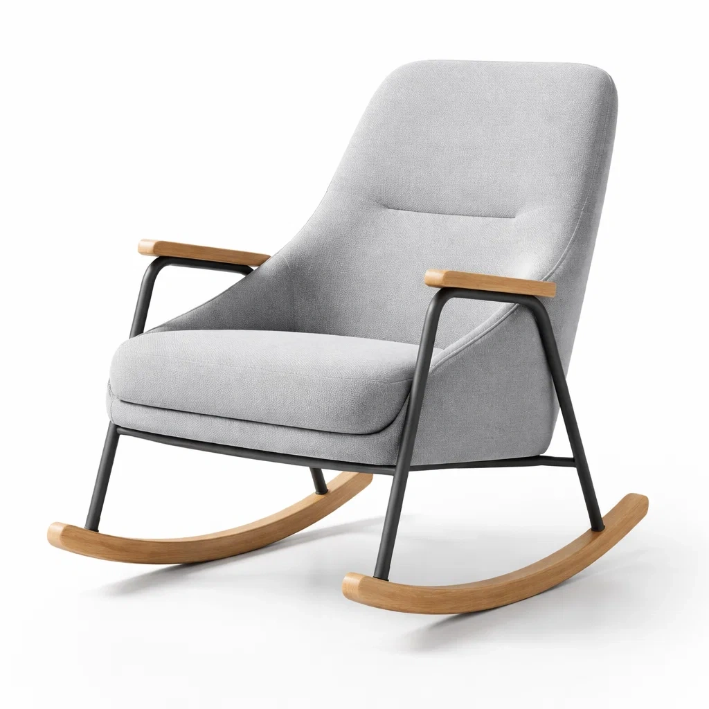Fauteuil à bascule en tissu gris avec cadre en acier et accoudoirs en bois