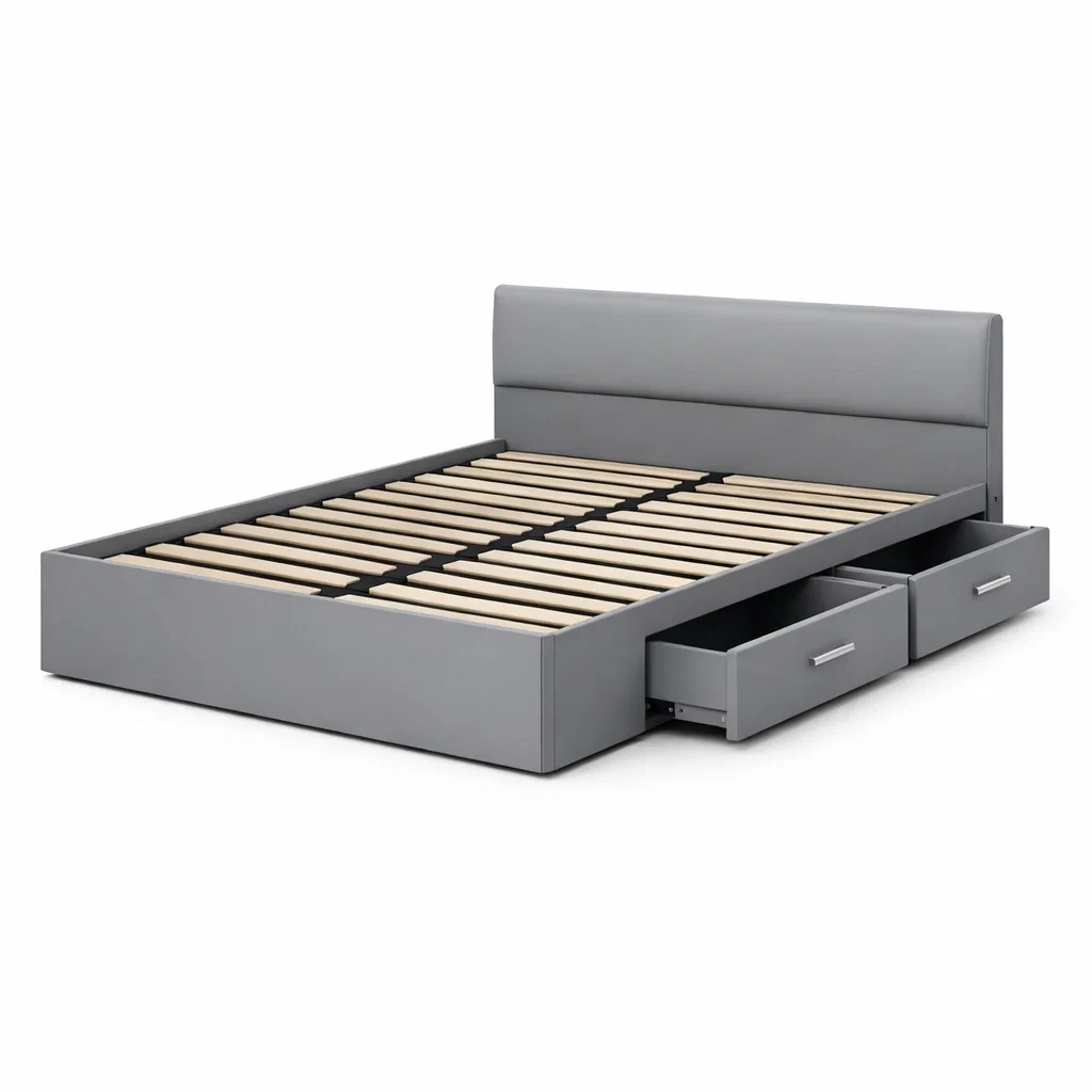 Ce lit double est doté d'une structure en bois recouverte de simili cuir et de lattes en contreplaqué. Il mesure 200 cm de long, 140 cm de large et 100 cm de haut. La couleur principale est le gris. Le lit comprend deux tiroirs intégrés pour le rangement. Un assemblage est requis.