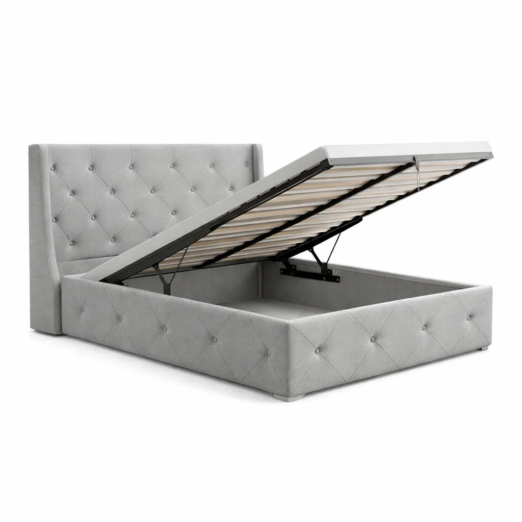 Ce lit double est revêtu de tissu en polyester avec un rembourrage en mousse. Il dispose d'un espace de rangement intégré. Ses dimensions sont de 200 cm de longueur, 160 cm de largeur et 110 cm de hauteur. Ce produit est destiné aux adultes.
